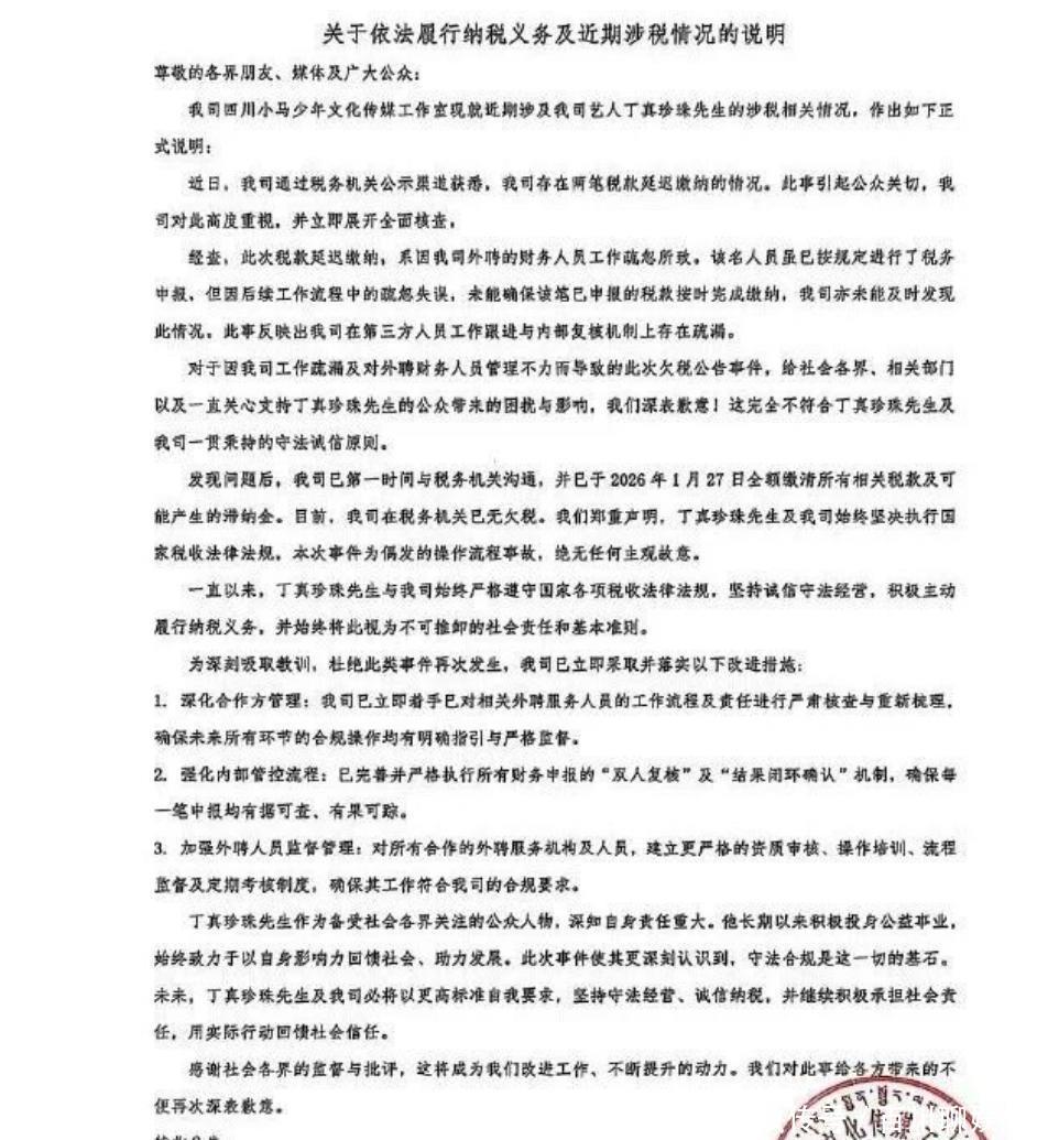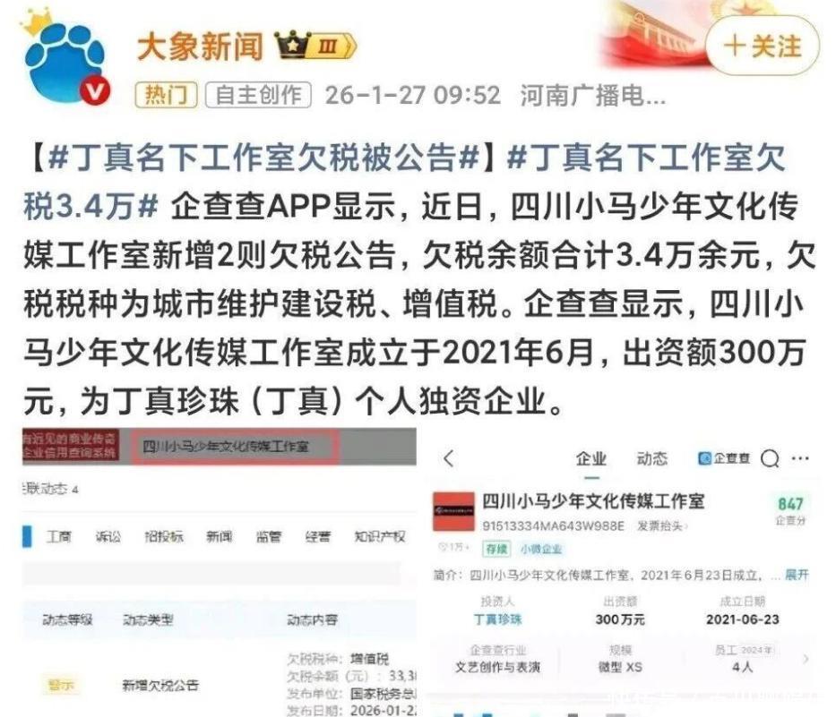 1月27日,丁真名下的工作室因欠税3.4万被公告引起了一种热议,而丁真工作室也在当天发布了情况说明,并表示出现税款延迟缴纳是因为外聘的财务人员疏忽导致,目前已经缴清税款以及滞纳金,丁真工作室表示这次事件是偶发的操作事故,并非是主观故意的行为。