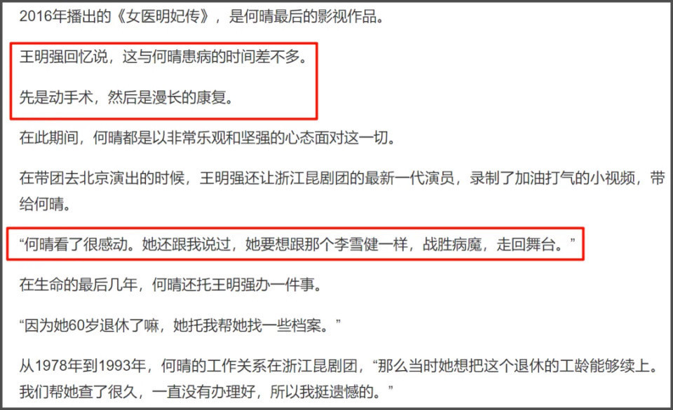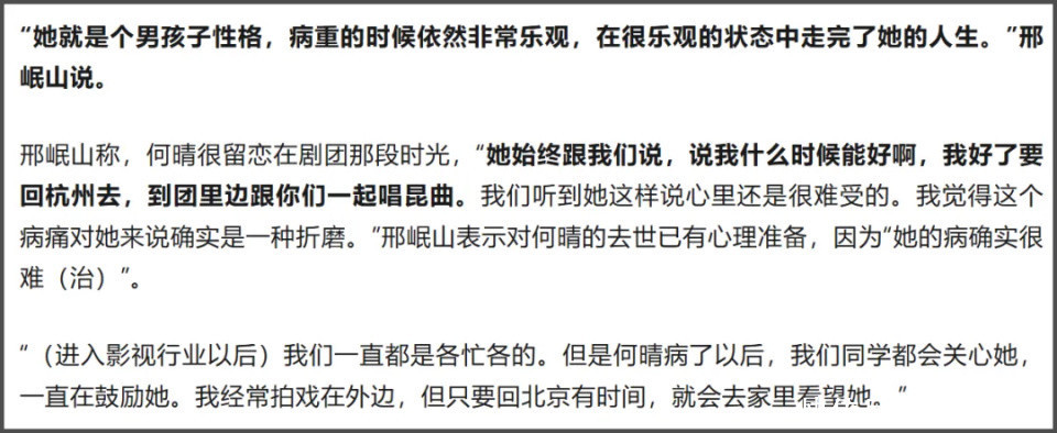 好友邢岷山也透露何晴很乐观,一直说等好了就回剧团和大家一起唱昆曲,到生命的最后时光,何晴依旧怀揣对表演的热爱。