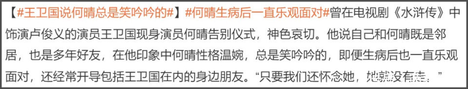 而在电视剧《水浒传》饰演卢俊义的男演员王卫国,也现身接受媒体采访。他透露他和何晴既是邻居也是多年好友,两人常有往来,何晴没事儿的时候还去王卫国家聊天,有时候何晴还会打电话让王卫国送她去医院。没想到何晴生病最常照顾她的是朋友和邻居。