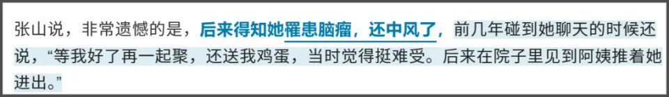 据《三国演义》赵云扮演者张山透露,何晴罹患脑瘤,后来还中风了。在何晴离世前几年,张山还偶遇何晴被阿姨推着进出,两人见面还聊天,当时的何晴非常乐观,还和张山约定等她好了再一起聚聚。