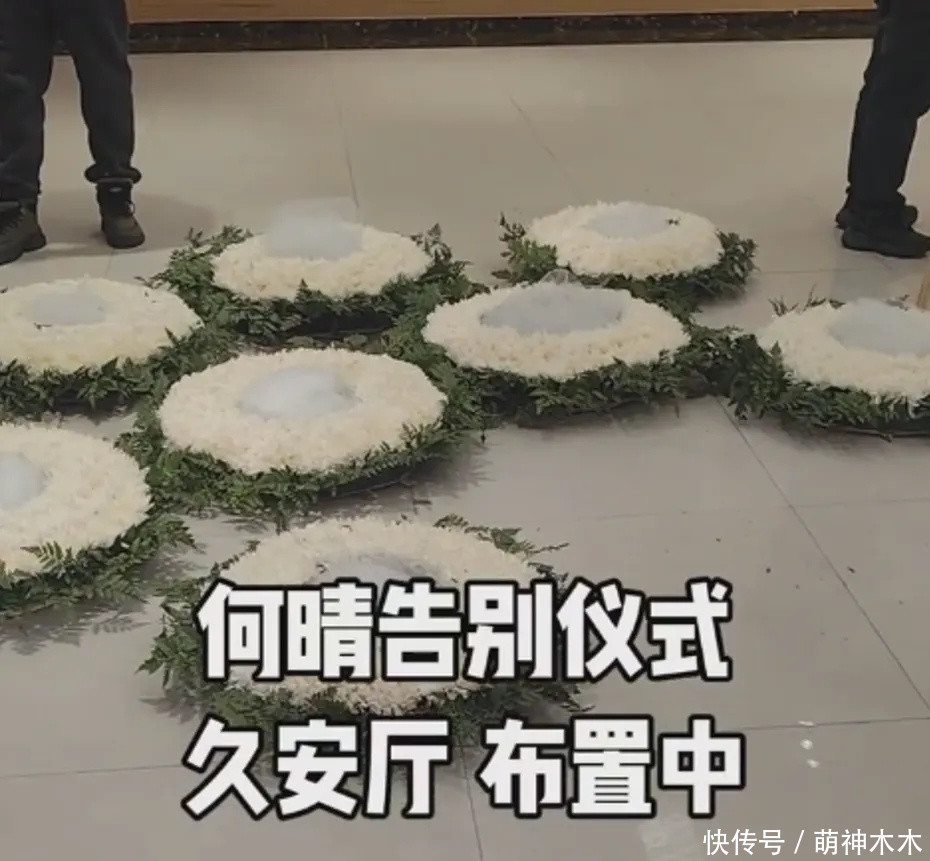 有网友晒出为何晴告别仪式做准备的画面,众人一早就开始布置了,大厅两边摆满纯白色的花圈。